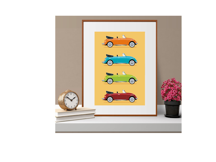4 Volkswagen Beetle Cabriolet Convertible Classic Iconic Car Illustration Art Profile Sideview Poster, Print, Souvenir, Gift, A4, A3, A2