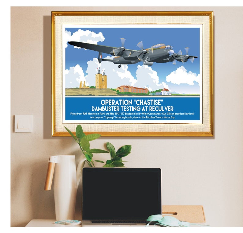 Reculver Towers Avro Lancaster Bouncing Bomb Dambuster 617 Squadron Poster, Plane, Herne Bay Kent, Print, Retro Gift, A4, A3, A2 sizes